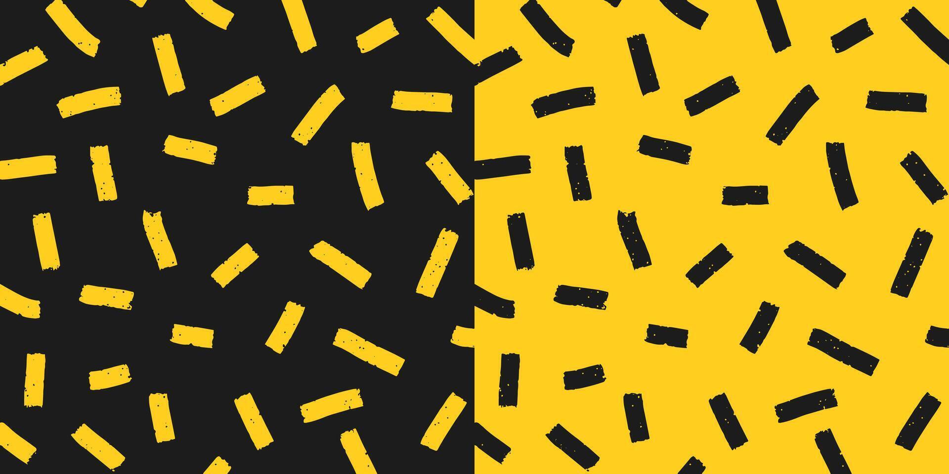 Set of two hand drawn square patterns, chaotic textured scratches on black and yellow background. Pencil textured strokes and dots, rain, sketch. Pro Vector