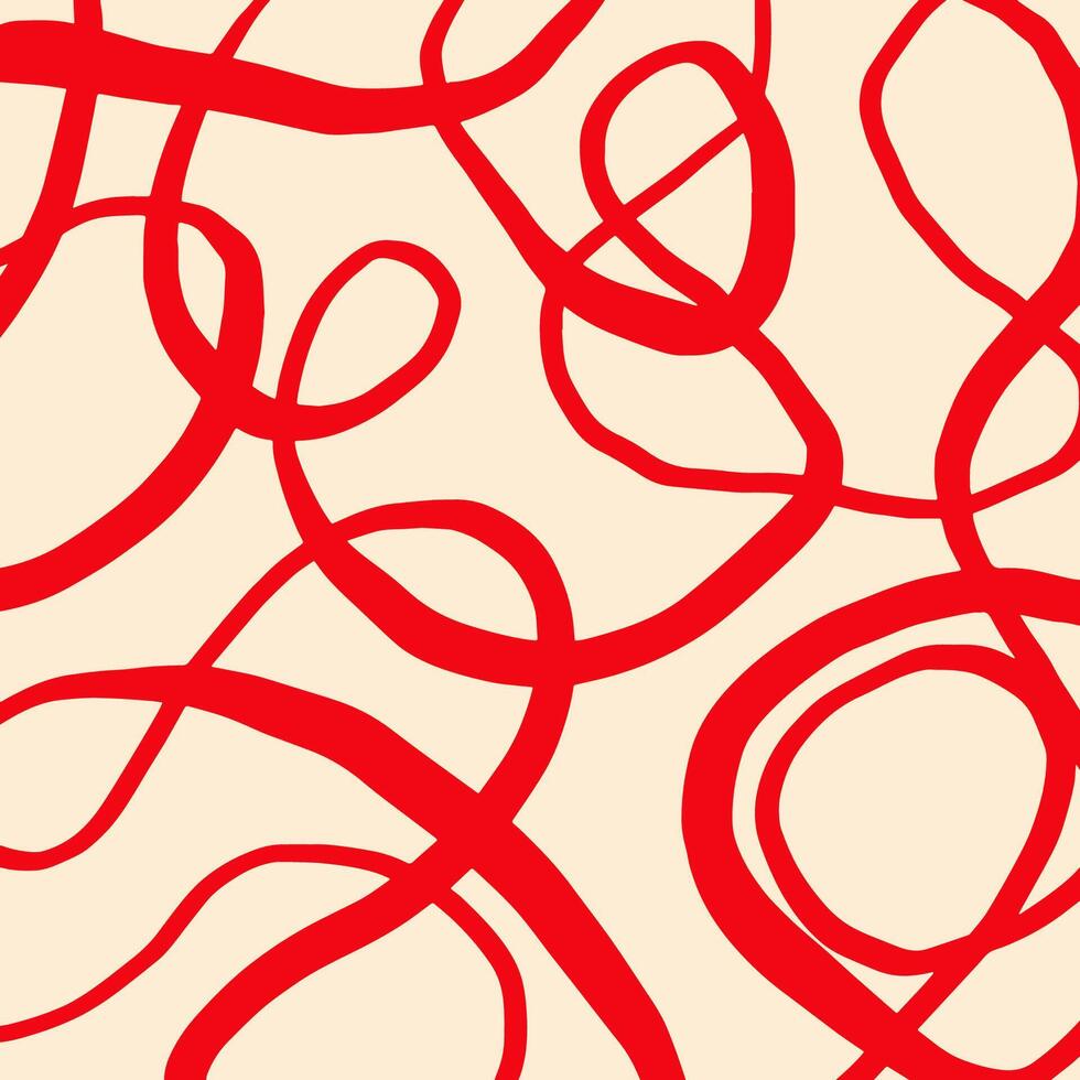 Playful hand drawn pattern, curved red lines of different thickness. Pencil textured lines on beige background, doodle swirls, wavy strokes, crosshatch. Sketch illustration. Pro Vector