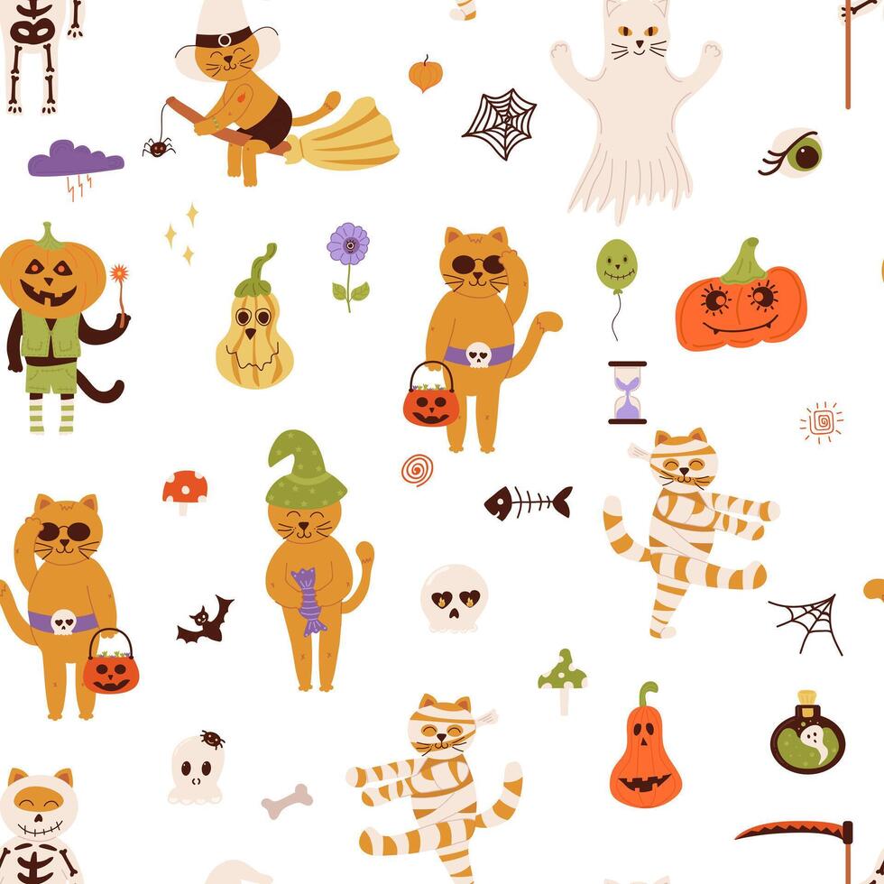 Halloween theme seamless design pattern background with a cat on a broom, in a skeleton costume with a scythe, a mummy, a ghost. Pro Vector