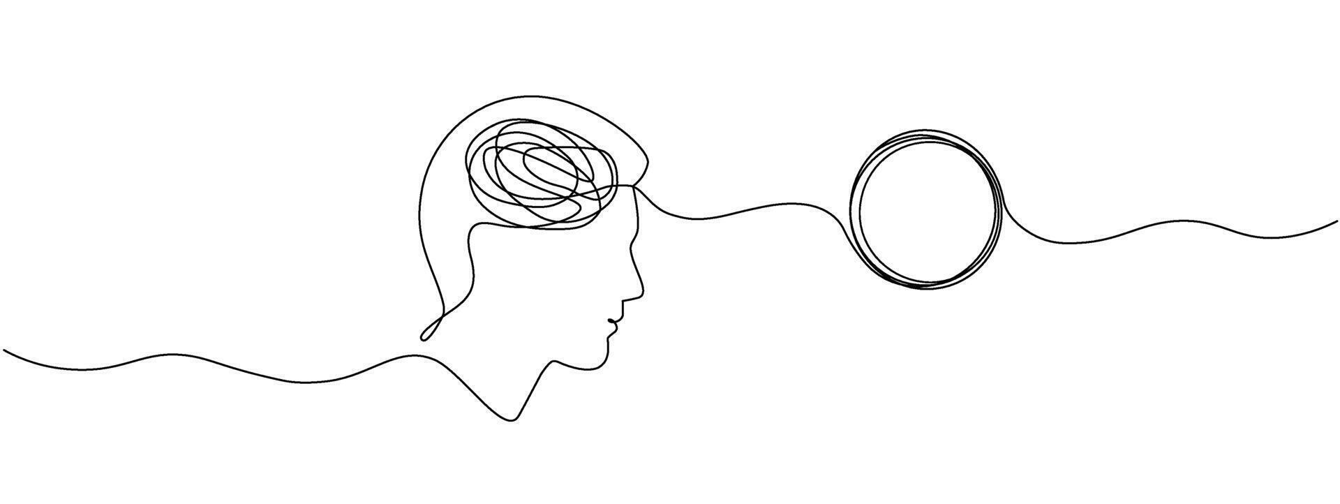 Head with tangled knot and unraveling thread of thoughts drawn in one continuous line. Concept of psychotherapy, mental health, problem solving . editable line illustration. Pro Vector