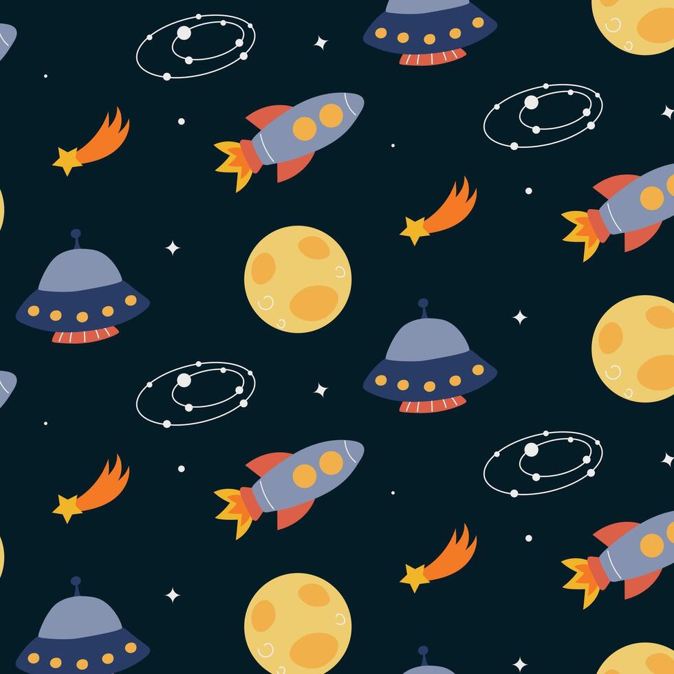 Bright space pattern, seamless pattern with planets and rockets Pro Vector