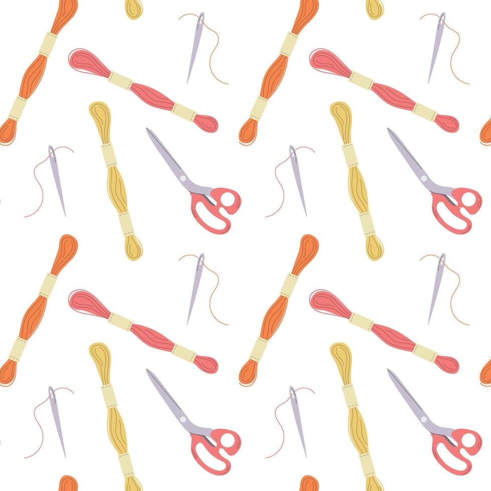 Seamless pattern with threads and needles, hand drawn with threads, needles and scissors, embroidery pattern Pro Vector