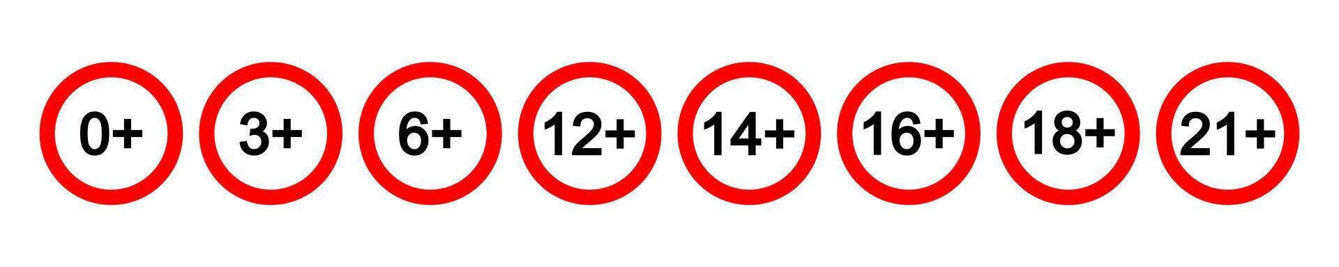 Numbers in circles with plus sign isolated on white background. Age censor symbol. Movie viewing or website visiting age limit marking. Kids allowed or adult only concept. Pro Vector