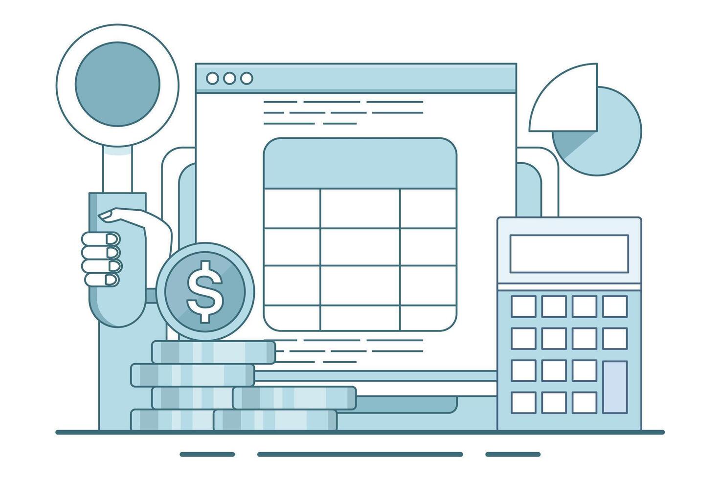 concept of calculating business profits, analyzing business data, calculating budgets, profits and losses, generating report graphs from data, calculator with spreadsheet creation reports. . Pro Vector