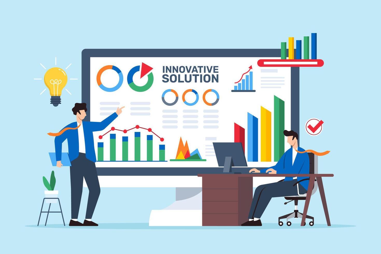 Flat illustration of two men conducting problem analysis with innovative solutions on computer screen Pro Vector