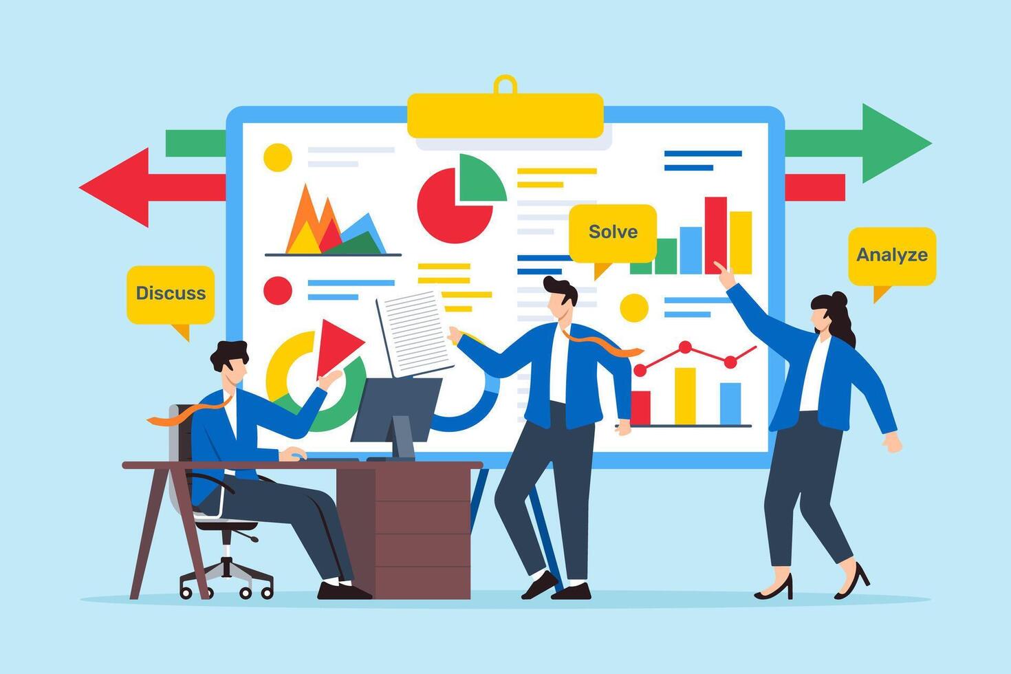 Flat illustration of team members working together to analyze problems and find solutions on whiteboard Pro Vector