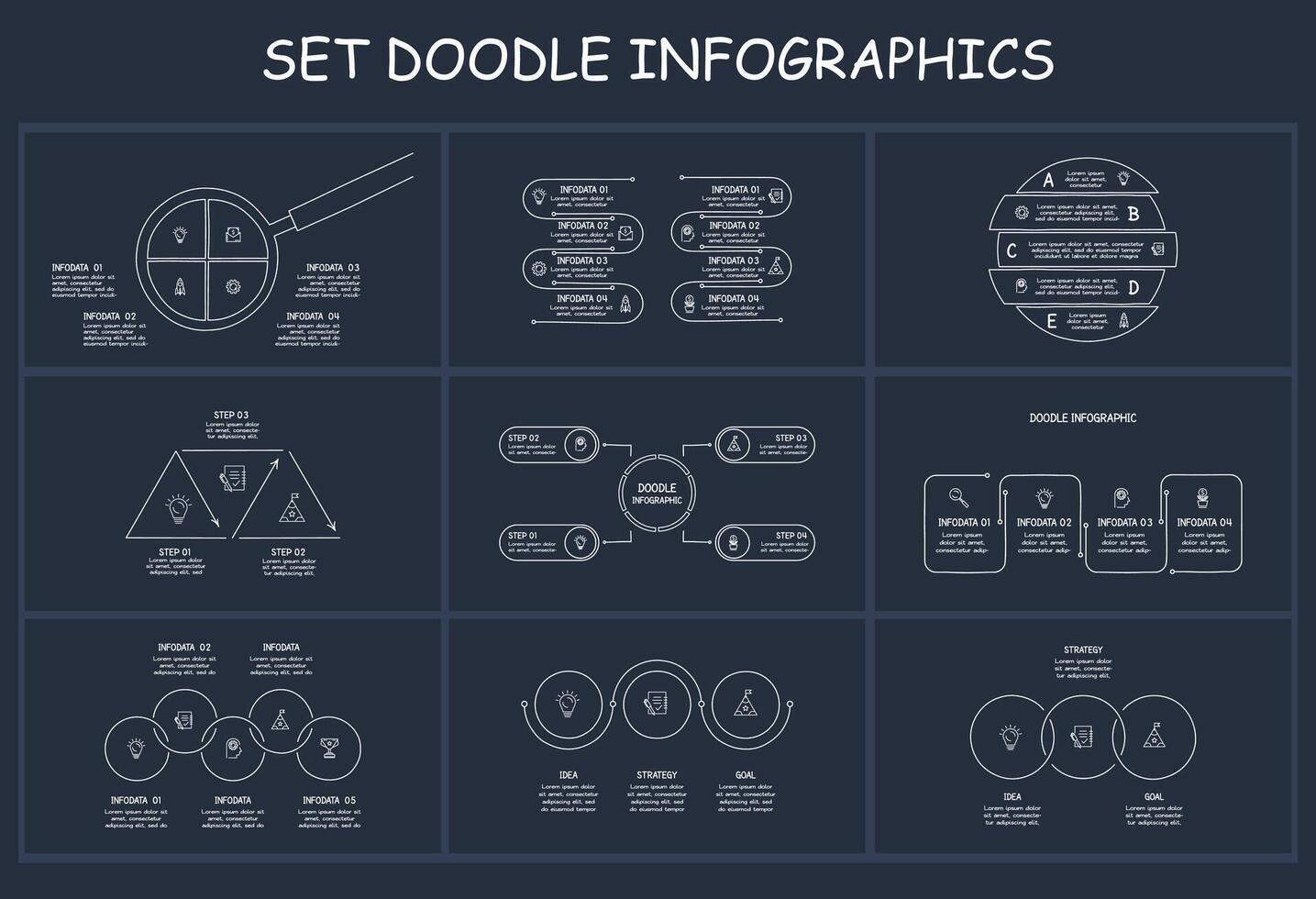 Set doodle dark infographics elements with 3, 4, 5, 8 options, template for web on a black background. Pro Vector