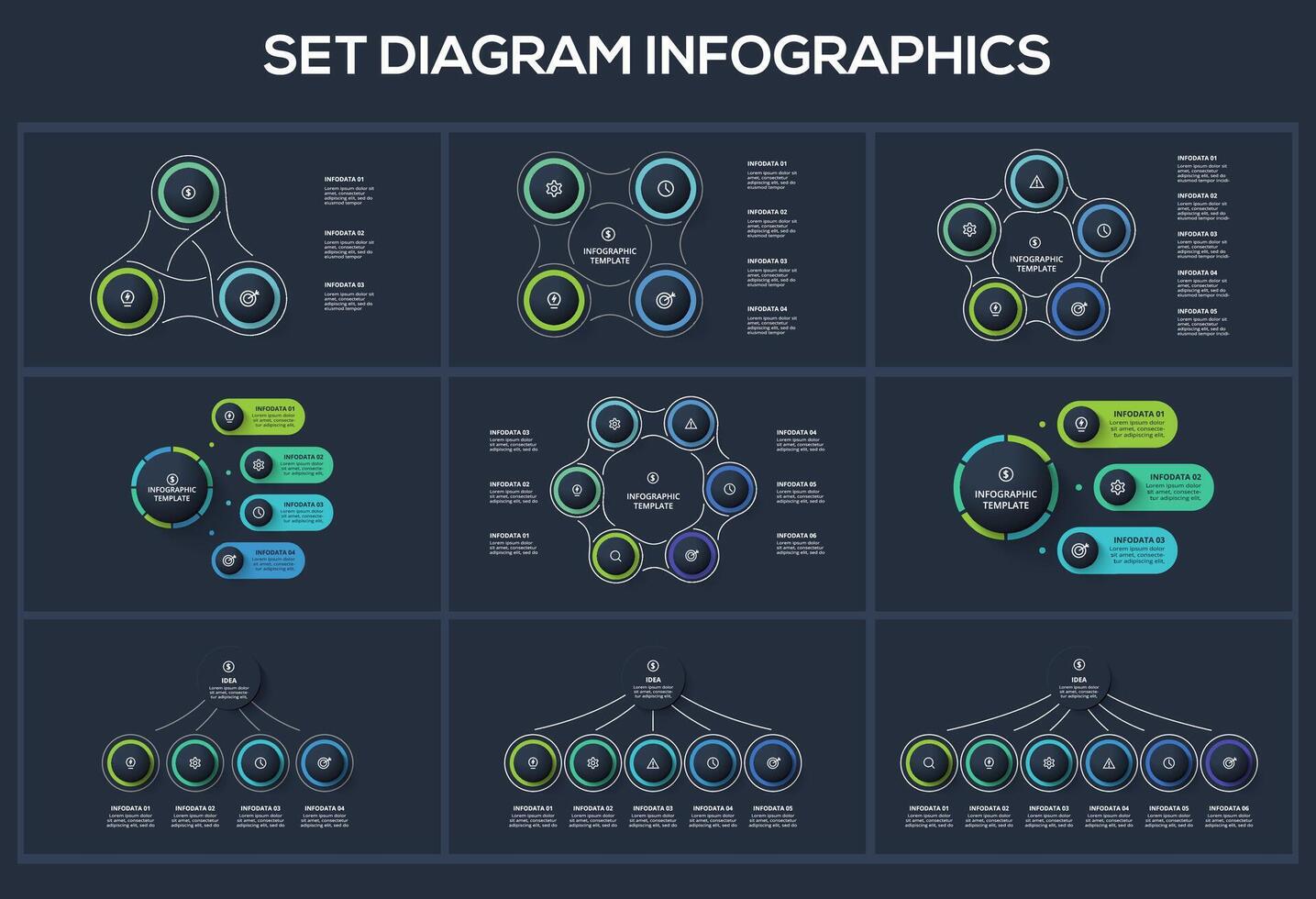 Set Diagram dark infographics elements with 3, 4, 5, 6 options, template for web on a black background. Pro Vector