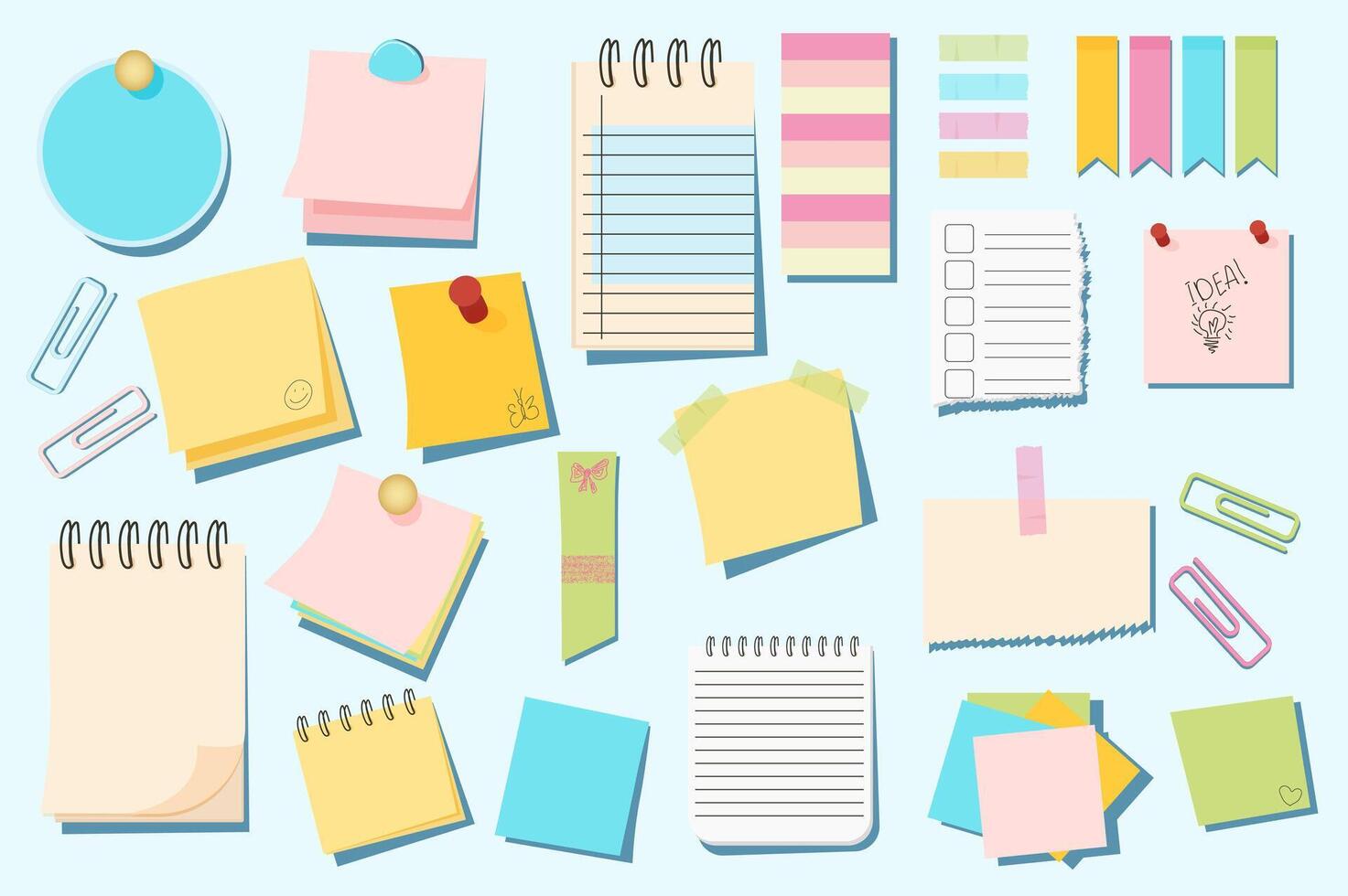 Cartoon sticky notes mega set elements in flat graphic design. Bundle objects of circle or square paper pages with pins, torn notepad sheets, to do lists, memo message reminders. illustration. Pro Vector