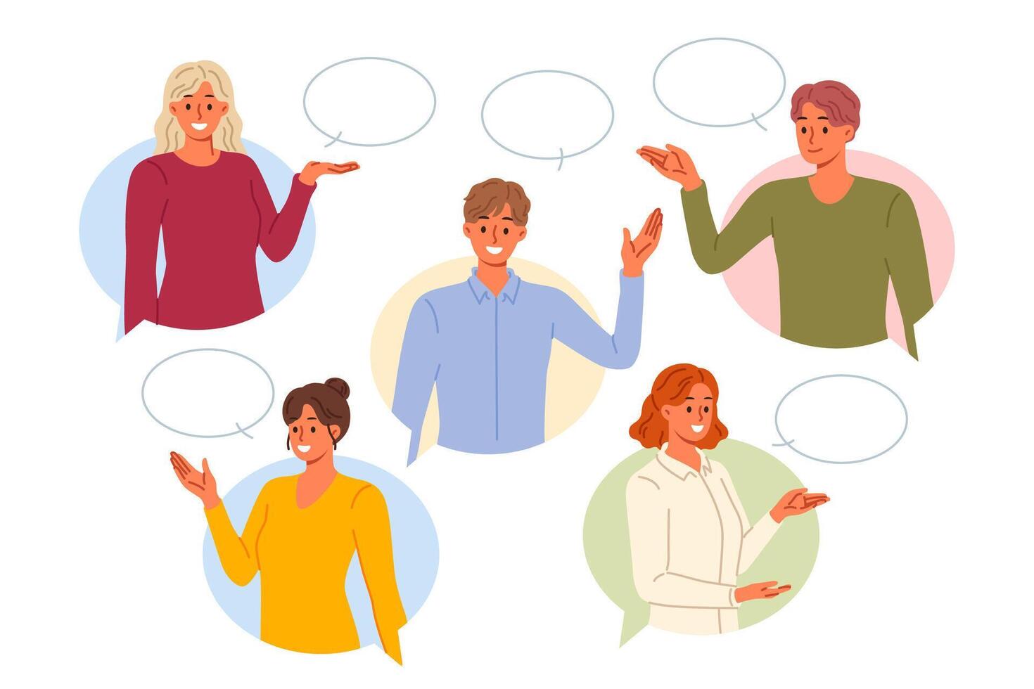 People are happy to communicate and share information while standing under conversation clouds Pro Vector