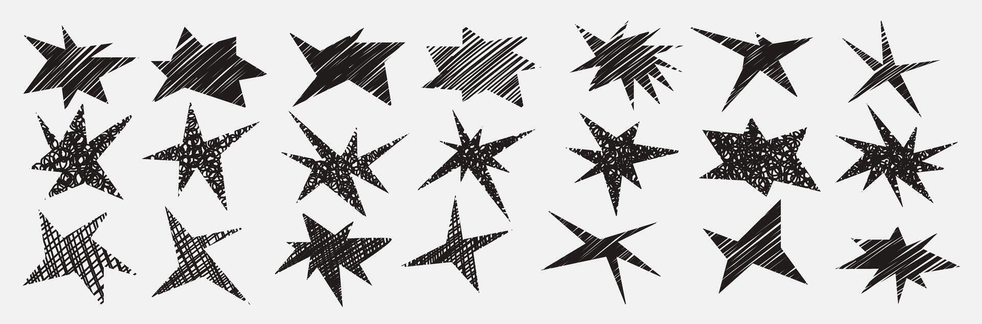 Set of abstract drawing texture stars shape. Retro spiked circle stickers. Bursting explosion star. Pro Vector
