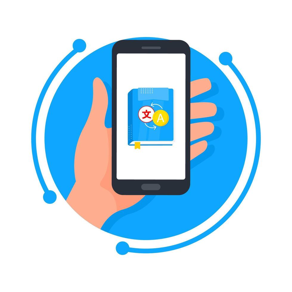 Illustration of a hand holding a smartphone with a language translator app open, symbolizing the ease of global communication and learning Pro Vector