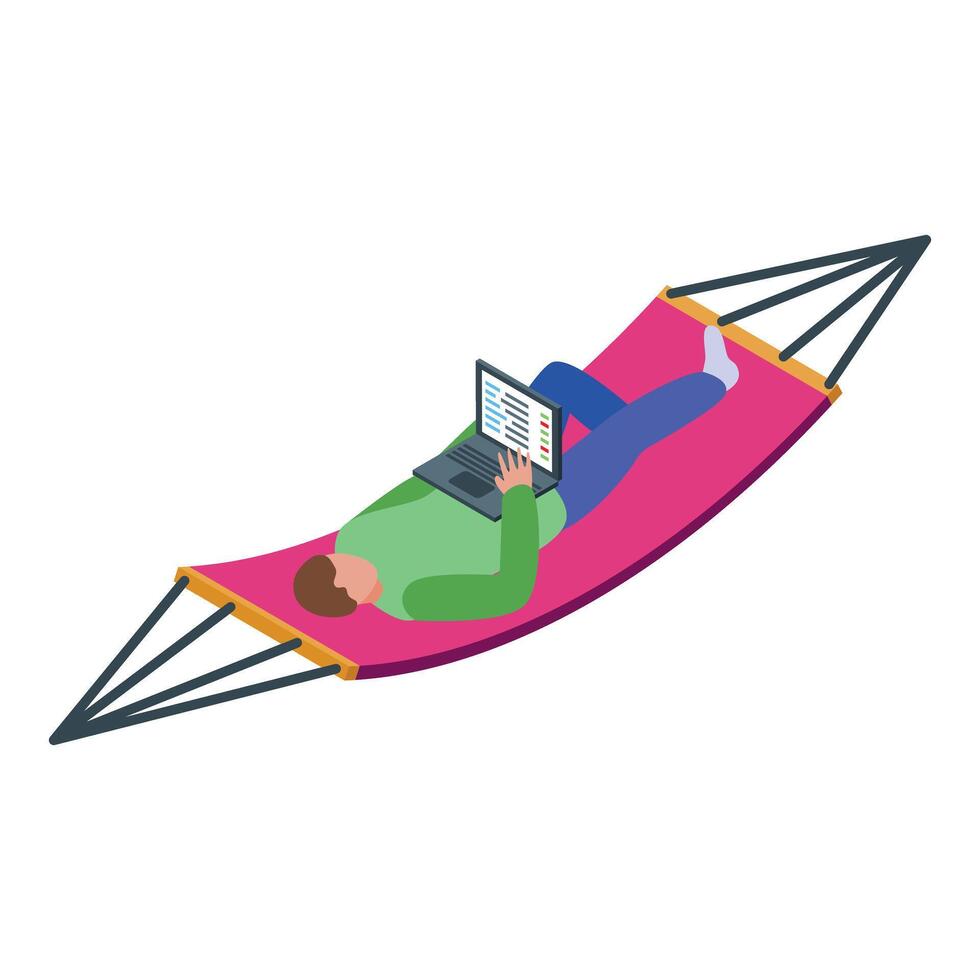 Freelancer working remotely lying on hammock using laptop Pro Vector