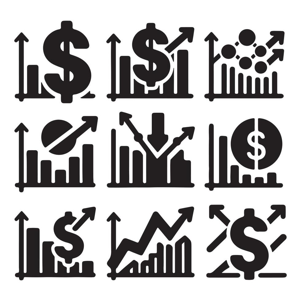 Set of chart icons with dollar sign in even silhouette on a white background. The graph shows downward and upward trends. Pro Vector