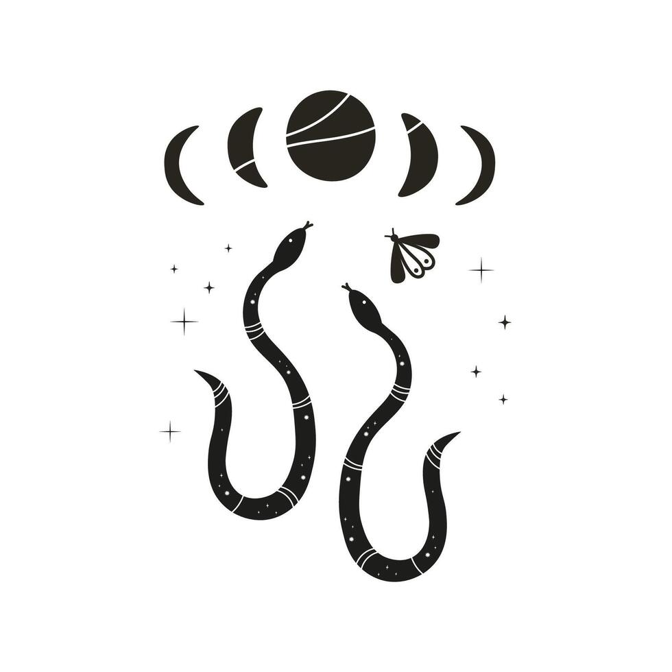 Abstract composition with snakes, moon, stars in boho style. Background Mystical motif for tattoo, poster, print, card, paper. The image created without the use of any artificial intelligence software Pro Vector