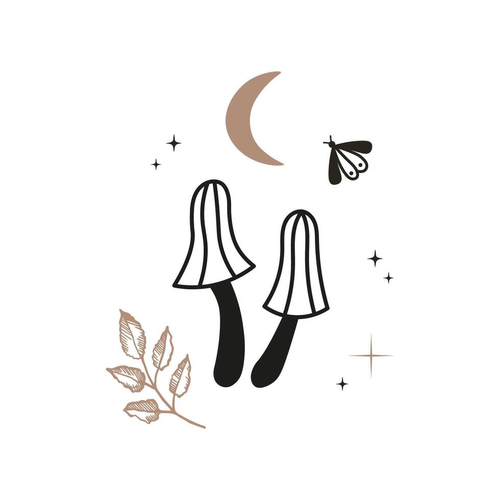 Abstract composition with mushrooms, moon, night butterfly, stars in boho style. Mystical motif for tattoo, poster, card. The image created without the use of any artificial intelligence software Pro Vector