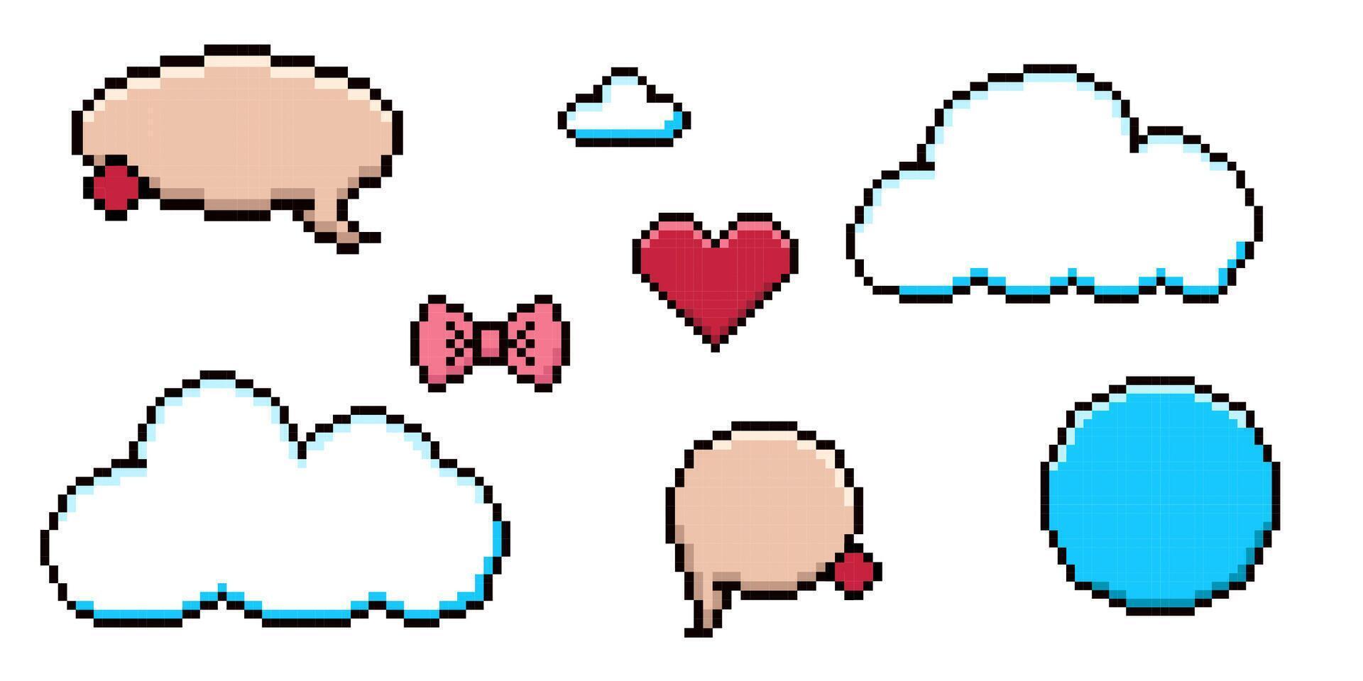 Set of pixel art dialogue box, heart, star, cloud. Speech bubbles in the mood of 90s aesthetics. 8-bit retro style illustration. Pro Vector