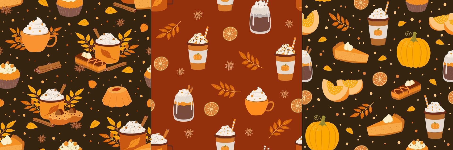 Set of autumn seamless pattern with coffe cup, latte, pumpkin spice and pie Pro Vector