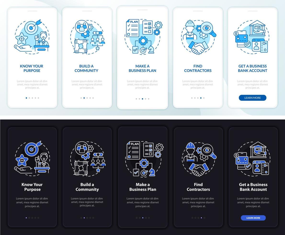 Business launching tips onboarding mobile app page screen. Startup walkthrough 5 steps graphic instructions with concepts. UI, UX, GUI vector template with linear night and day mode illustrations Pro Vector