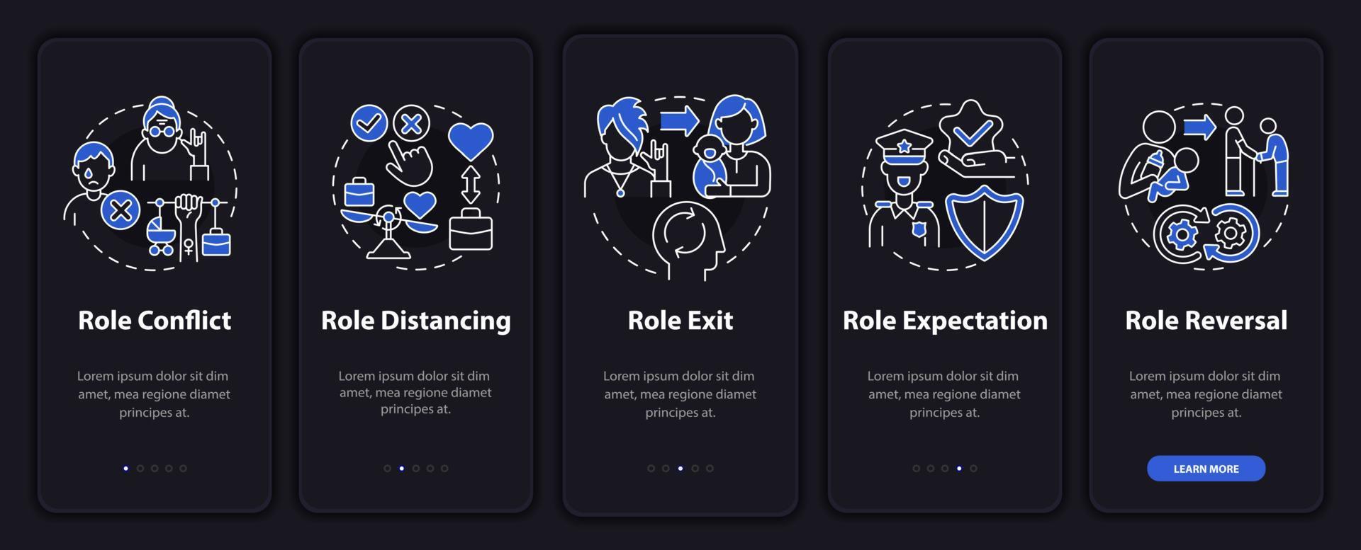 Social function concept onboarding mobile app page screen. Community activity walkthrough 5 steps graphic instructions with concepts. UI, UX, GUI vector template with linear night mode illustrations Pro Vector