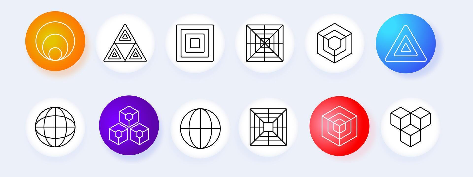 Geometric shapes set icon. Circles, triangles, squares, grid, cube, abstract design, sphere, pattern, symmetry, structure, 3D, , geometric, polygons, complexity, arrangement. Pro Vector
