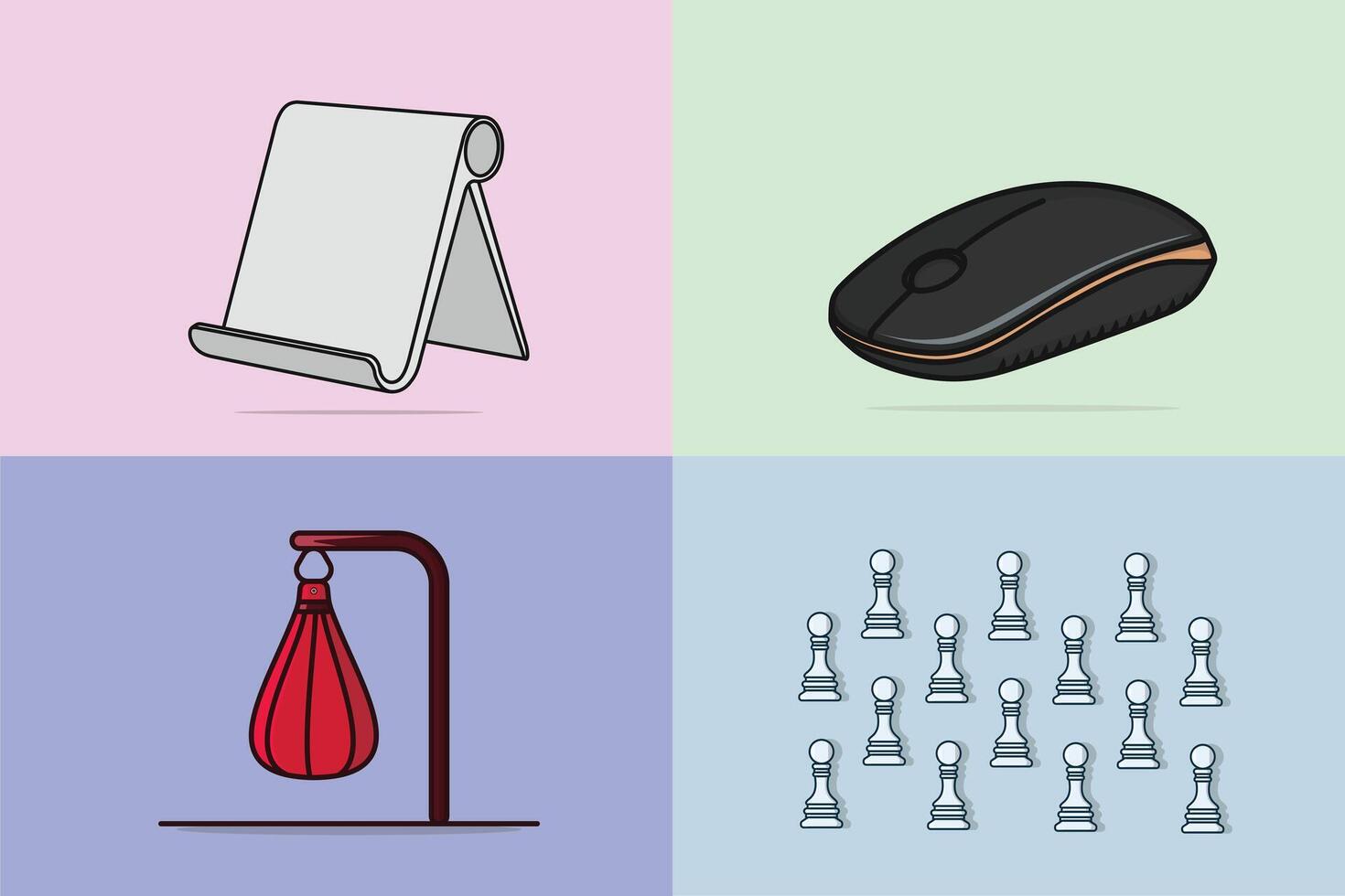 Collection of punching bag with Stand with Desktop Cell Phone Stand Tablet and Computer Mouse with Pawn Chess design. Pro Vector