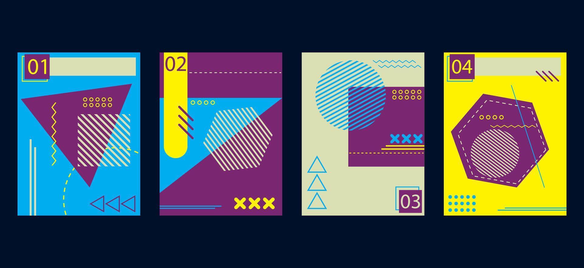 Memphis style background abstract brochure book covers set in modern minimalist geometric design. templates with circle, triangle, hexagonal and squares shapes Pro Vector