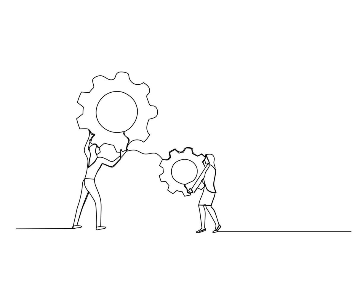 Minimalist line drawing of two figures holding gears. The larger figure holds a bigger gear, while the smaller figure holds a smaller gear, symbolizing teamwork, collaboration, and integration Pro Vector