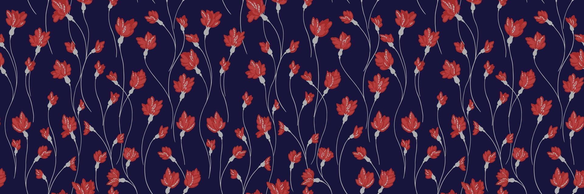 Creative florals stems seamless print on a dark background. Abstract artistic branches with tiny flowers small buds intertwined in a pattern. hand drawing. Simple ornament for designs, textiles vector