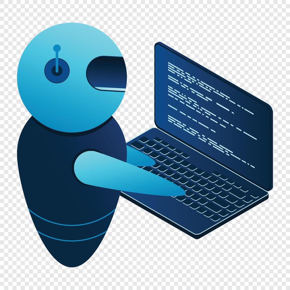 Futuristic robot interaction with computer. Isometric AI robot. Digital communication chatbots. illustration Pro Vector