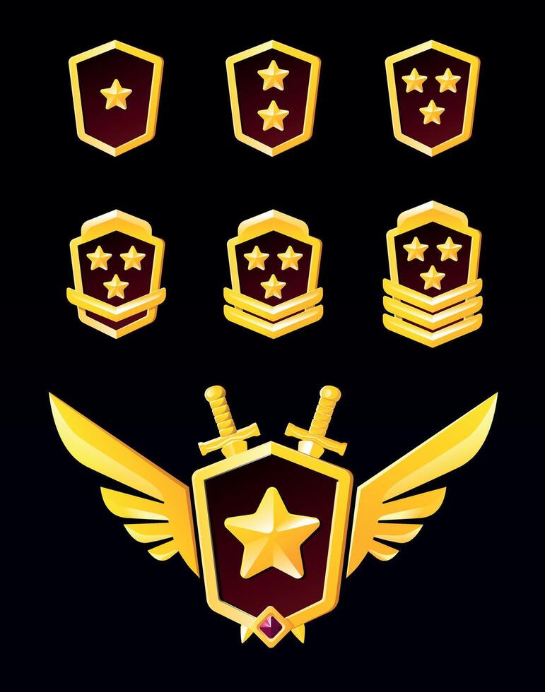 A set of cool game titles and ranks. High ranks with stars. Progress in fantasy app for rating army experience Pro Vector