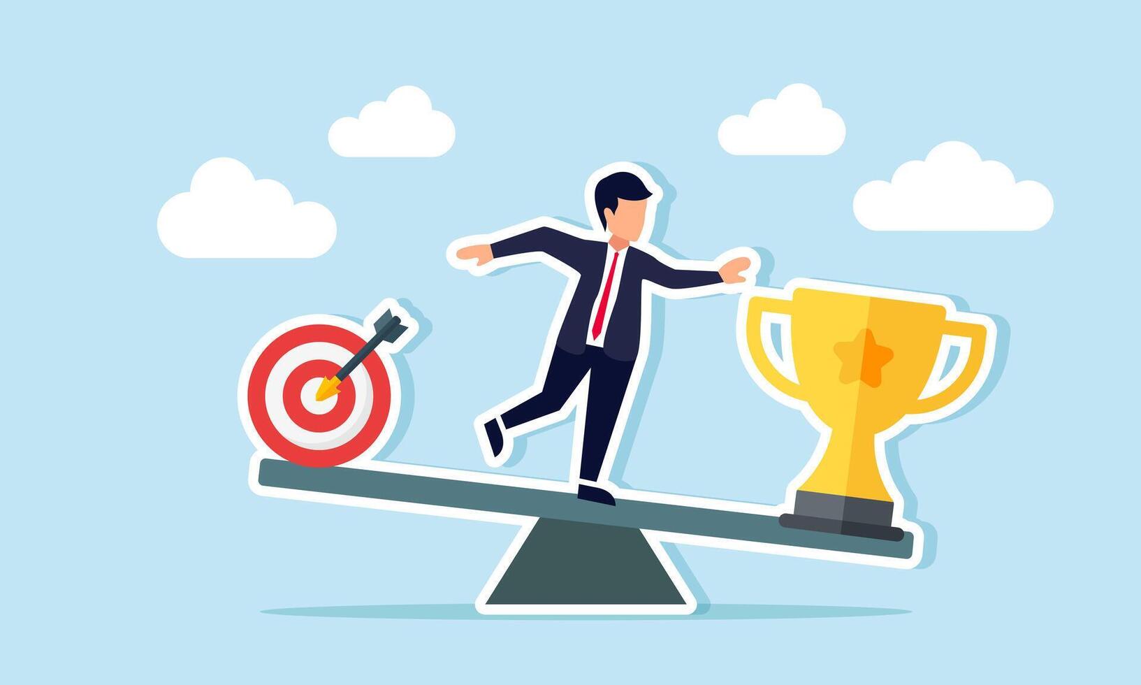 Deciding between achieving recognition for a job well done or meeting specific work targets concept of A businessman standing on a seesaw with a trophy on one end and a target board on the other Pro Vector