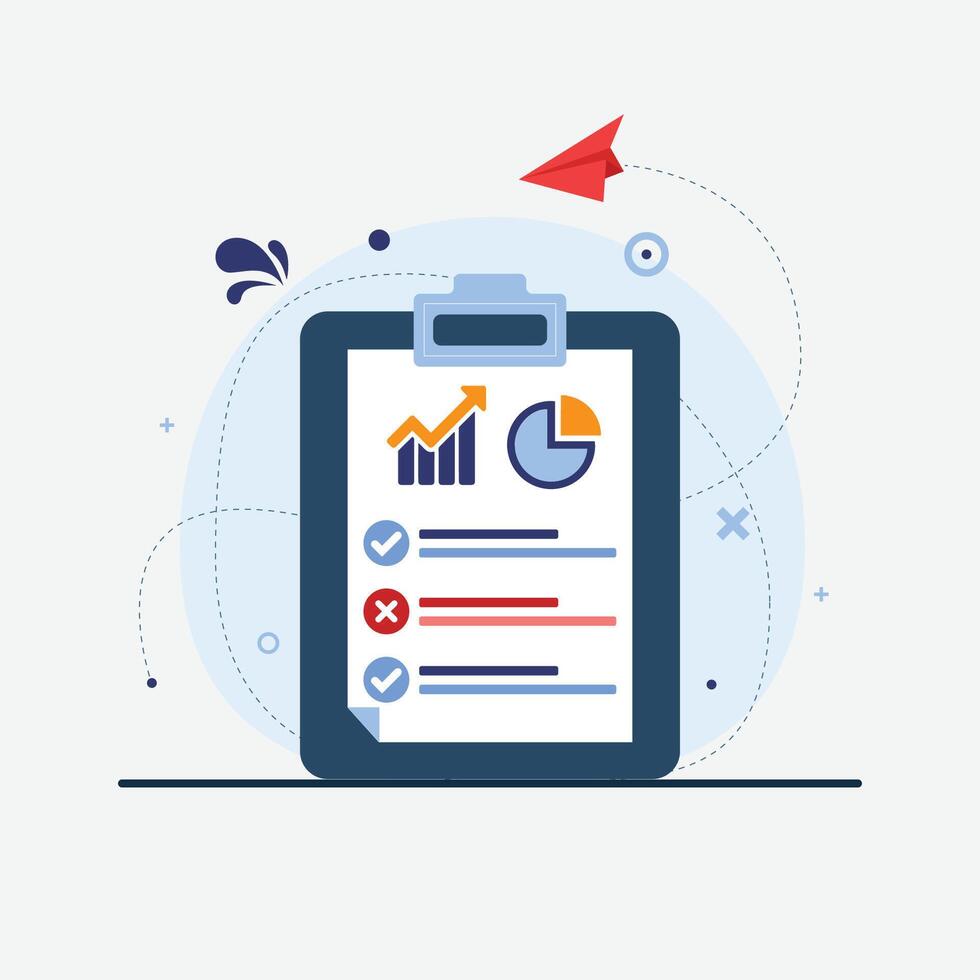 Clipboard illustration of analysis list with plane paper. Document with a sales schedule. Statistics, rise. Sales curve. Report sheet. Check mark Pro Vector