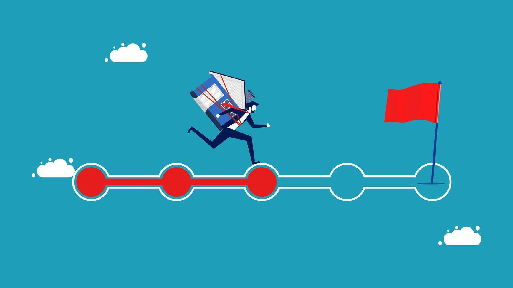 a man is running on a red arrow with a red flag, home progress Pro Vector