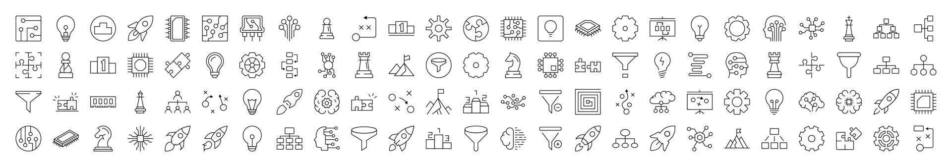 Line Icon Set of Data and Analytics. Contains Icons of Puzzle, Funnel, Gear, Cogwheel, Spaceship that Can Be Used for Design of Cards, Posts, Apps, Web Sites Pro Vector