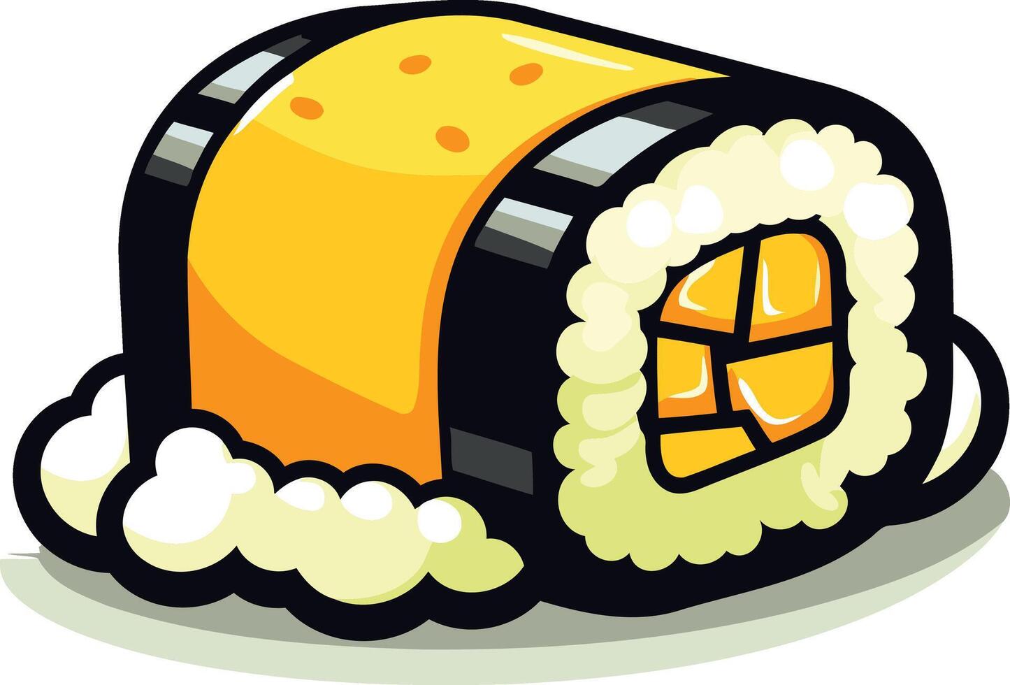 A cartoon style sushi roll with a yellow outer layer and visible rice and fillings vector