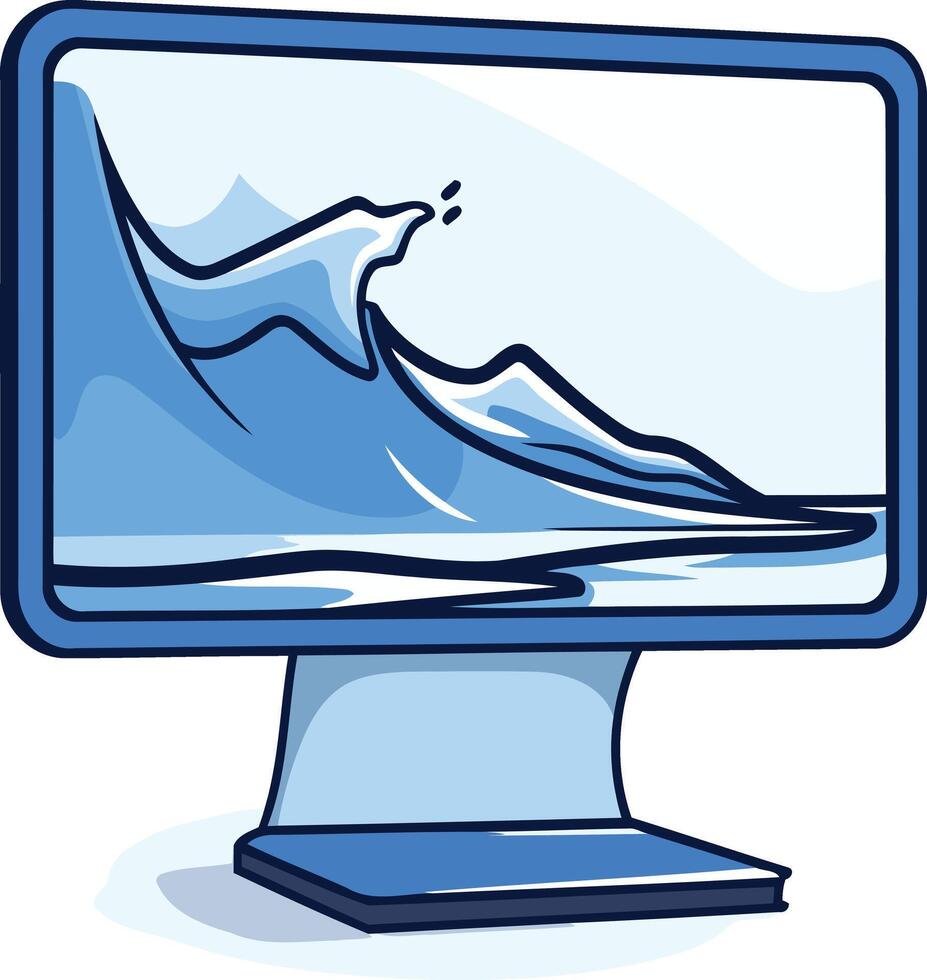 A cartoon style computer monitor displaying a blue wave crashing on a beach vector