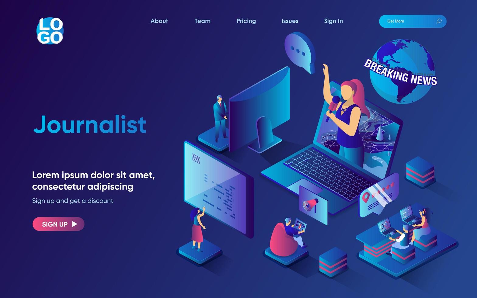 Journalist concept isometric landing page. Team creates news program in studio, writes articles for online newspapers, 3d web banner template. Vector illustration with people scene in flat design Pro Vector