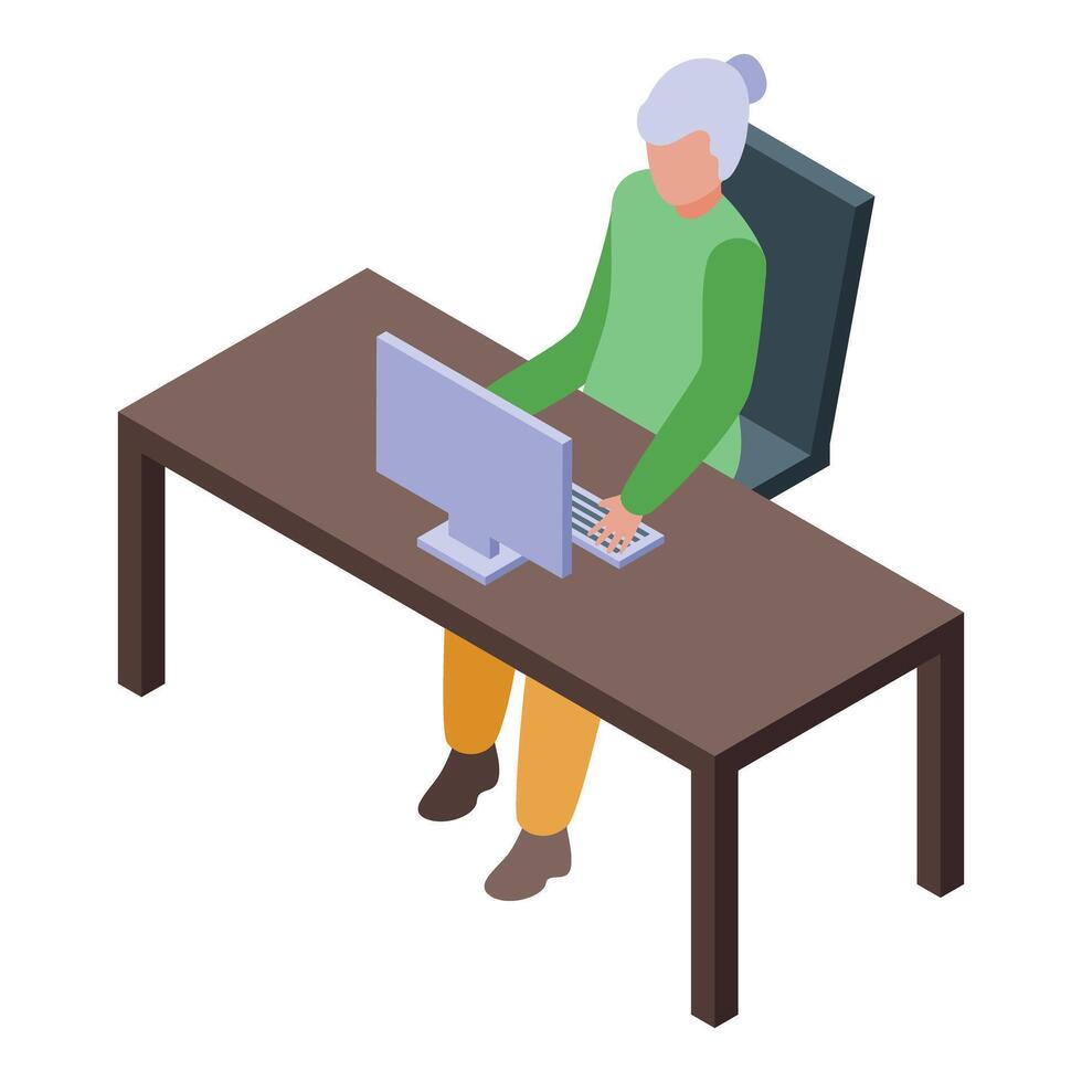 Senior woman using braille display keyboard working on desktop computer Pro Vector