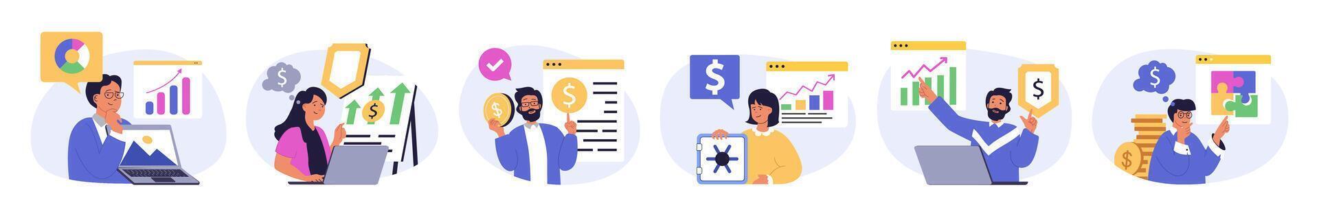 Business concept set in flat design for web. Collection with people brainstorming, making data charts analysis, managing processes, creating strategy, achieving financial goals. illustration. Pro Vector