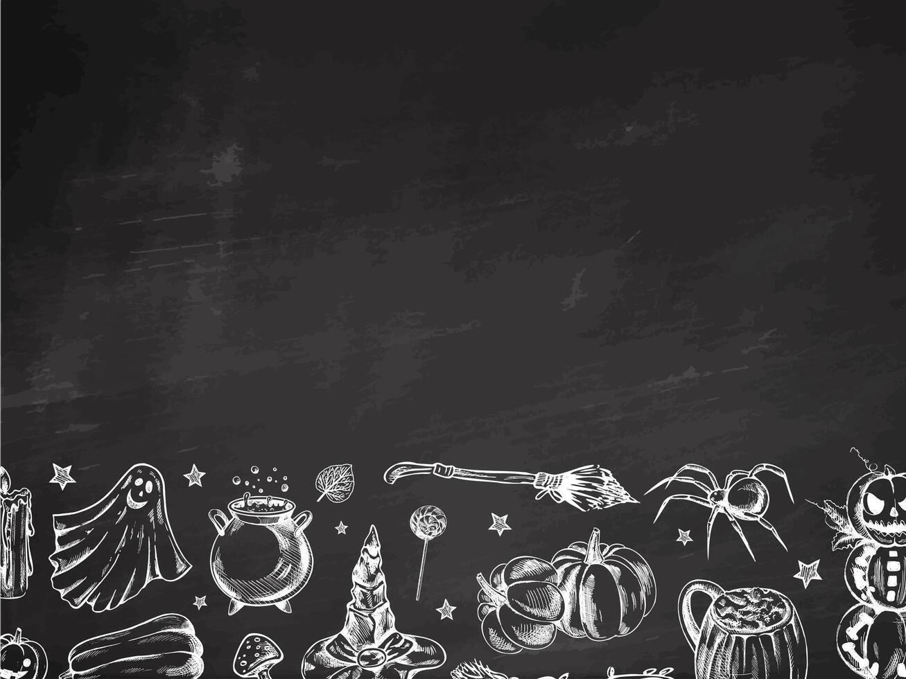 Set of halloween elements in sketch style. Design of ghosts, creepy and spooky elements for halloween decorations, sketch, icon. Hand drawn template on chalkboard background. Pro Vector