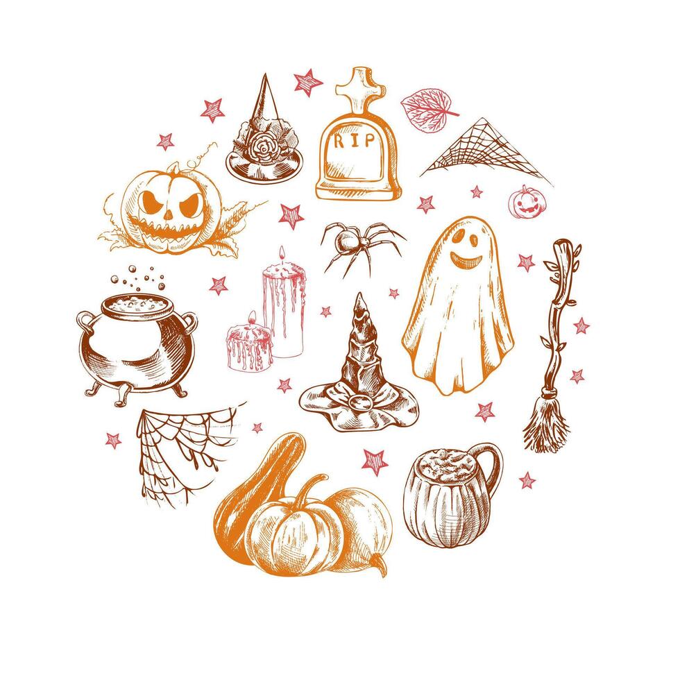 Set of halloween elements in sketch style. Design of ghosts, creepy and spooky elements for halloween decorations in circle, sketch, icon. Hand drawn isolated on white background. Pro Vector