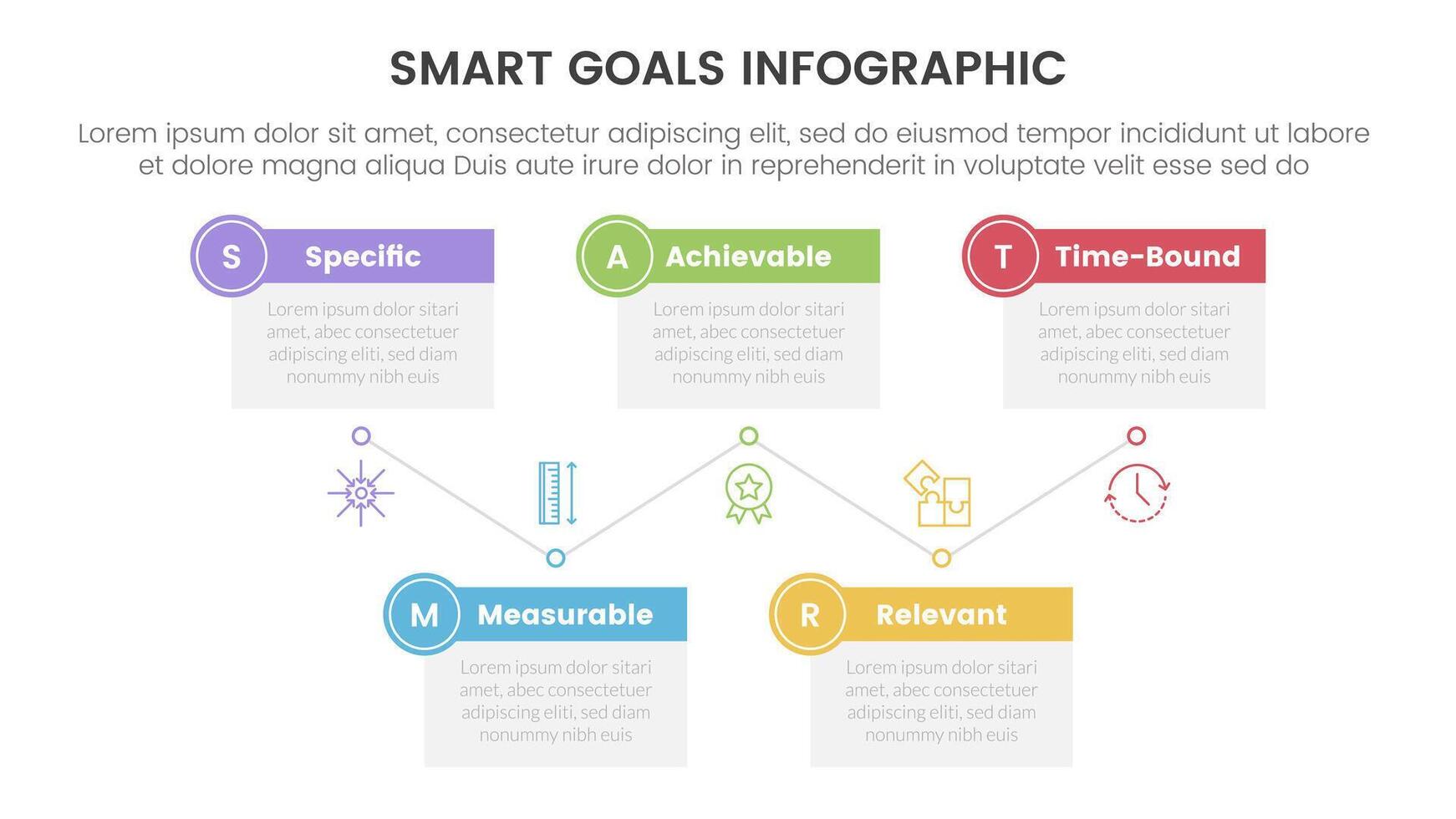 SMART goals setting framework infographic with box table up and down with 5 step points for slide presentation vector