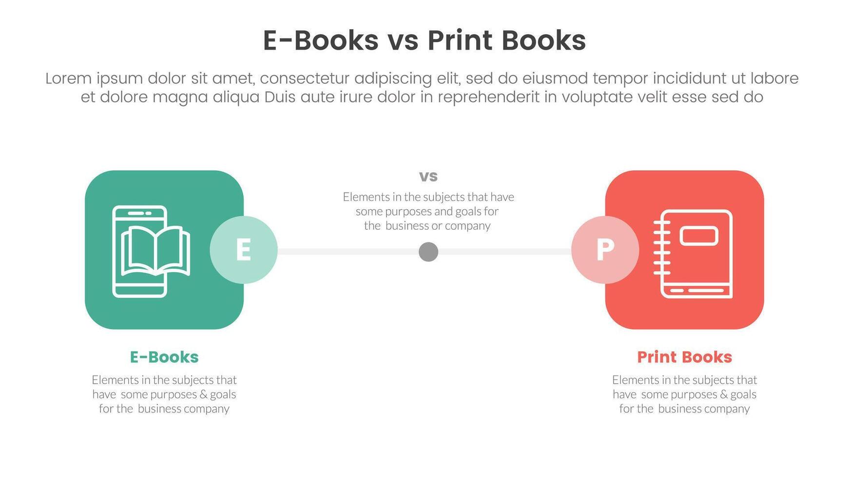 ebook vs physical book comparison concept for infographic template banner with round square box side by side with two point list information Free Vector