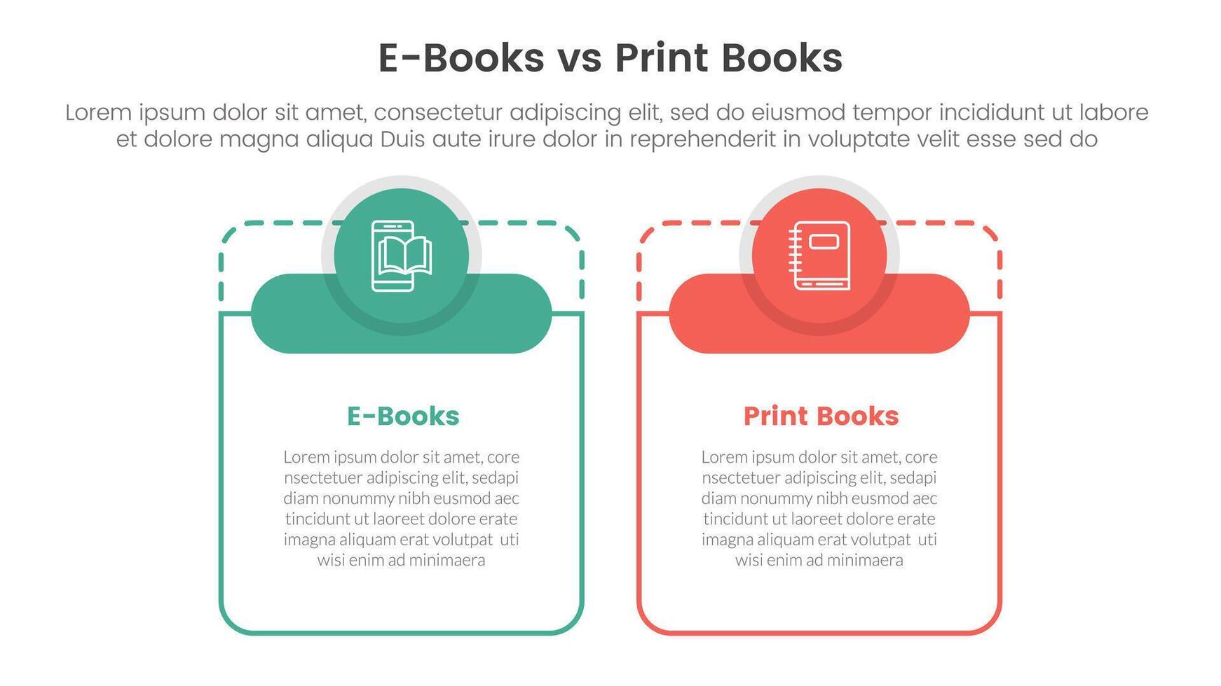ebook vs physical book comparison concept for infographic template banner with big table shape round circle header with two point list information Free Vector
