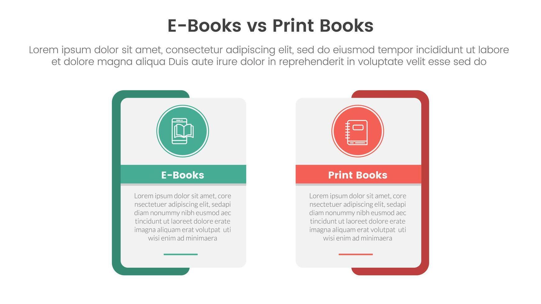 ebook vs physical book comparison concept for infographic template banner with rectangle shape bold outline and circle badge with two point list information Free Vector