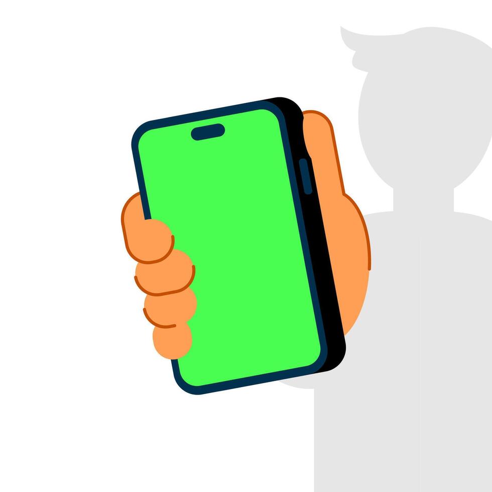 hand displaying and presenting smartphone screen, showing mobile phone concept illustration flat design. simple modern graphic element for banner template, ui, infographic Pro Vector