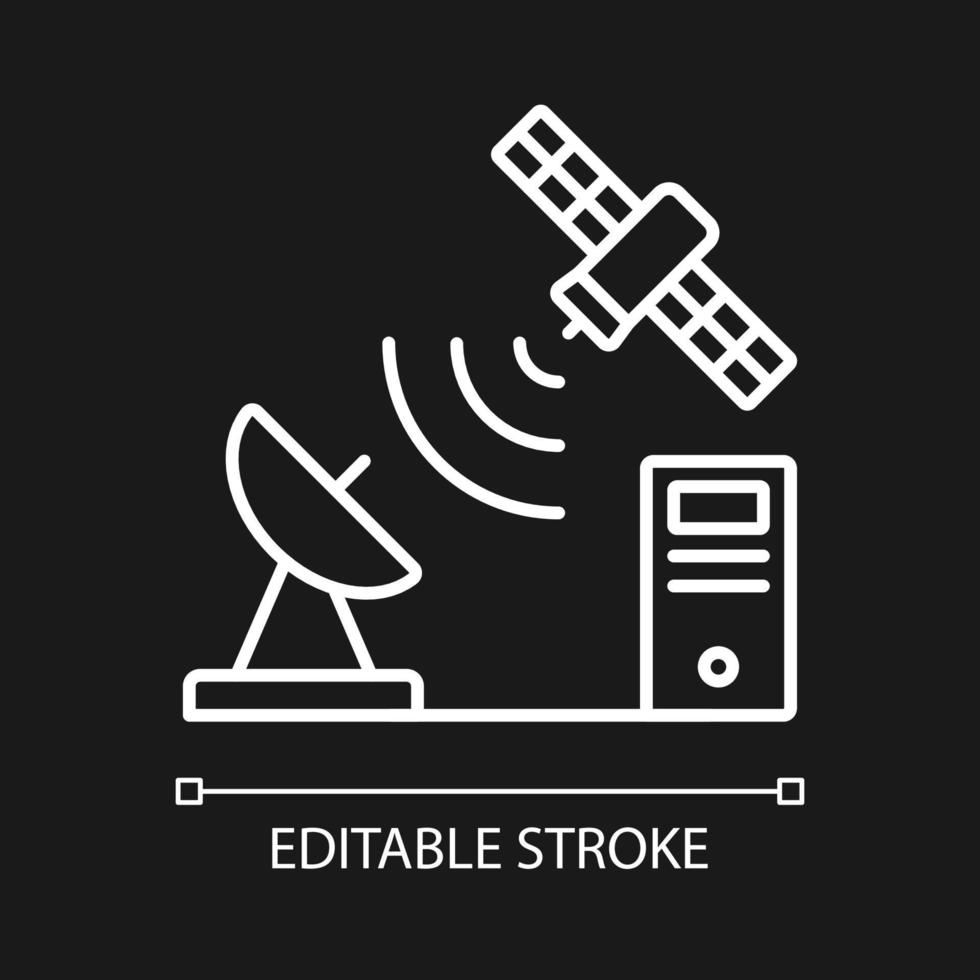 TCP over satellite white linear icon for dark theme. Global telecommunications network connection. Thin line customizable illustration. Isolated vector contour symbol for night mode. Editable stroke Pro Vector