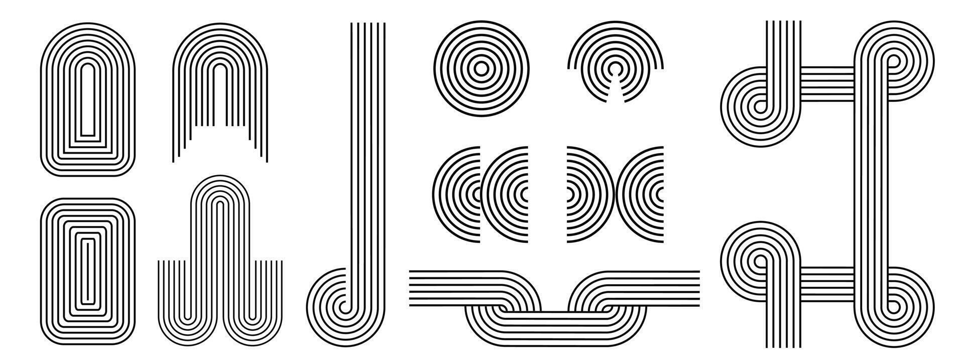 Linear abstract geometric elements, circle, arch, wave, retro mid century shapes icon set in boho zen style. Bauhaus pattern abstract geometric. Pro Vector