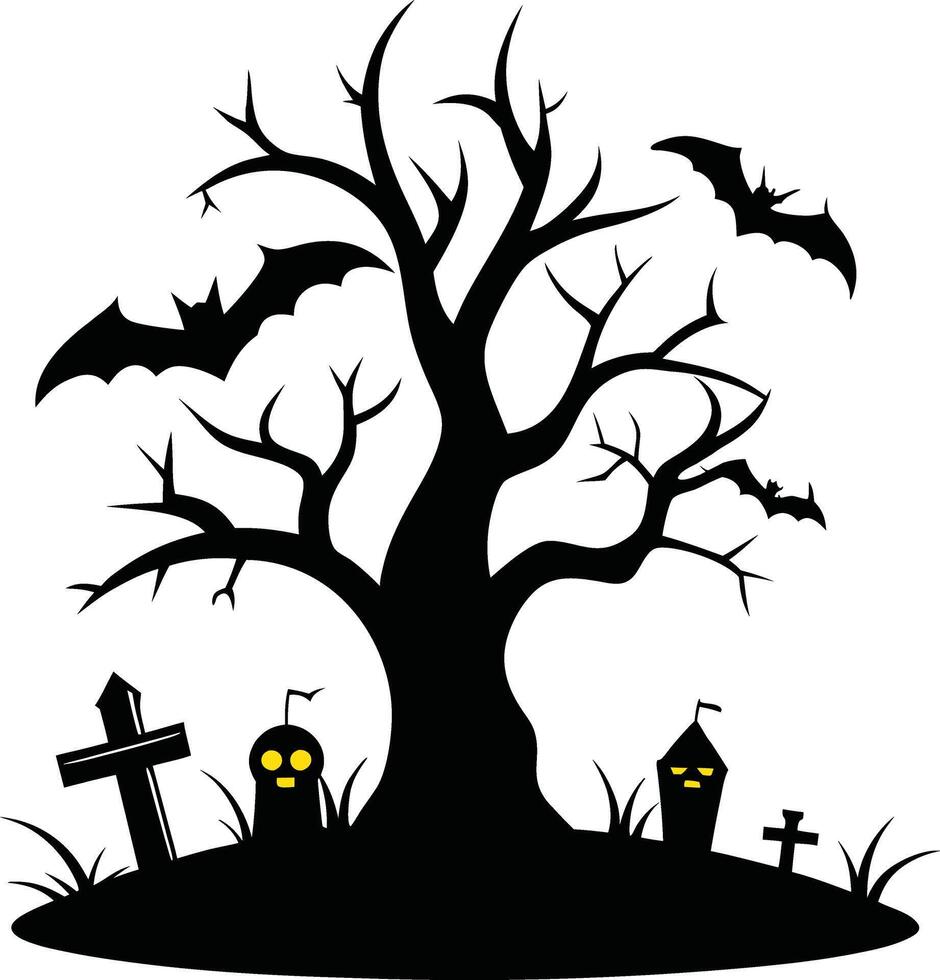 Halloween tree in graveyard and bat illustration vector